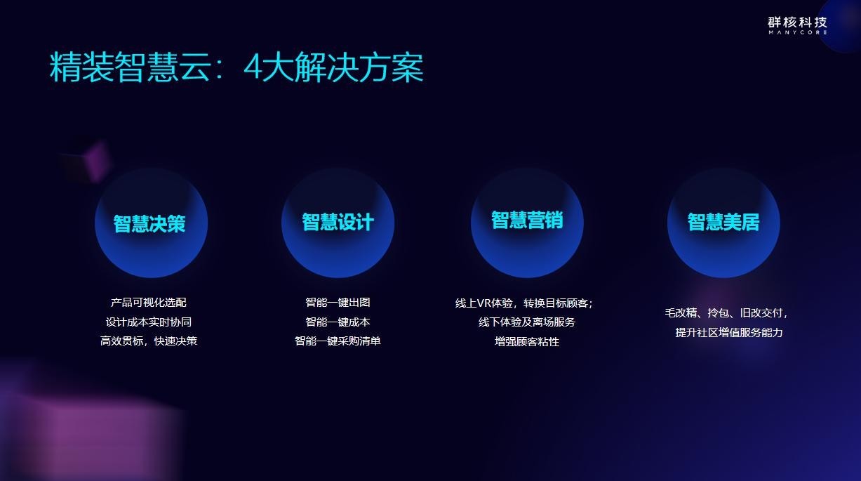 面对地产精装数字化转型趋势,群核科技现场正式发布房产精装智慧云,即基于智慧决策、智慧设计、智慧营销、智慧美居等四大应用场景,为地产企业提供的四大解决方案。