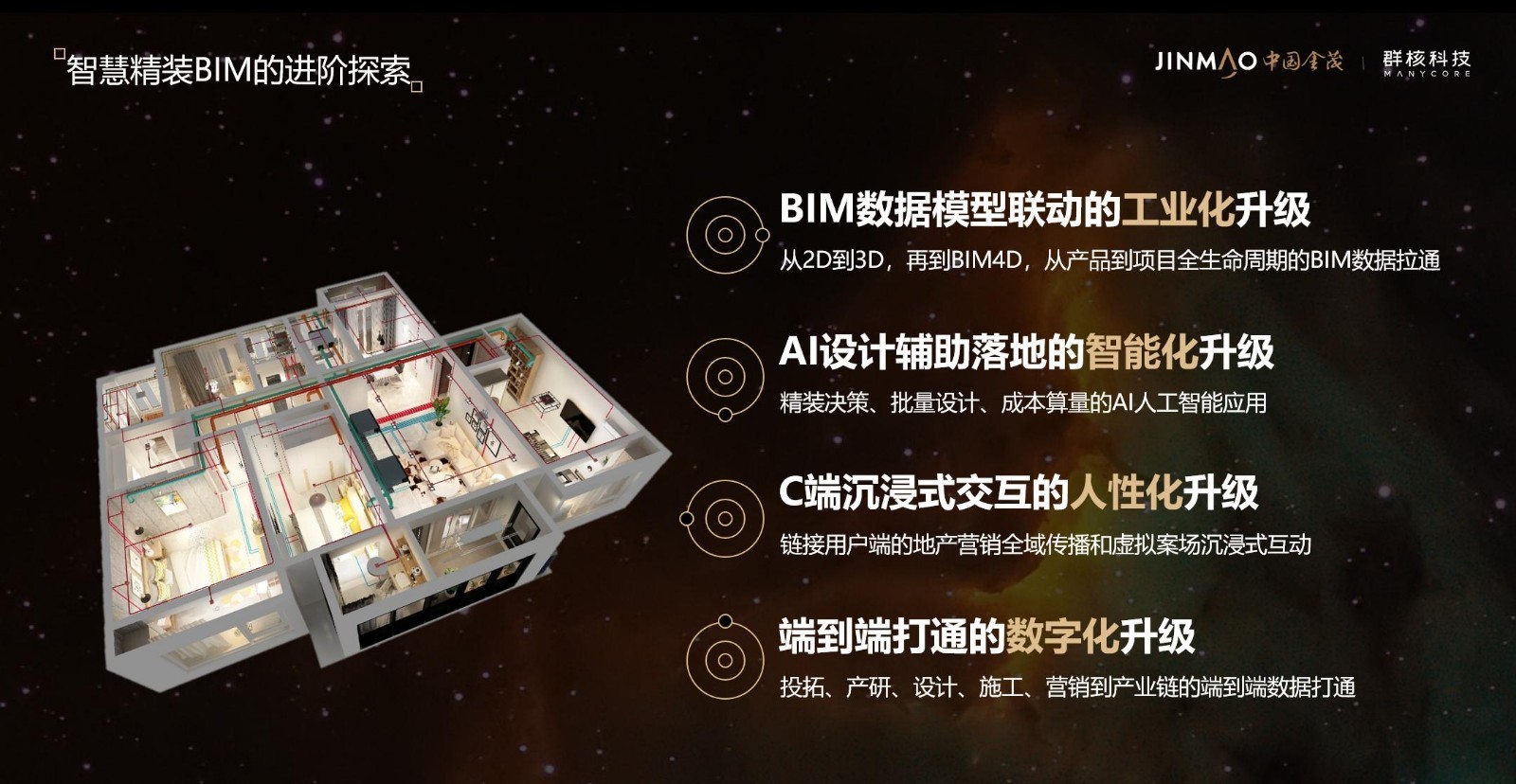 一直以来,金茂以“智慧科技”的产品力著称,用科技创新来打造出更舒适、更聪明的房子。金茂华北精装智慧云是金茂实现精装产品化+数字化的全新实践,在已有精装产品系7大装标、8大系统的独创IP成果基础上,金茂华北携手全球云设计领域的独角兽企业群核科技,利用BIM、AI、虚拟现实、云计算等技术硬核,加速精装产品及业务全面升级进入智慧精装BIMMore+时代,在智慧决策、智慧设计、智慧营销及智慧加载等多个场景进行应用。它将助力企业设计提效,赋能营销转化,打通智慧精装产业链,提升数字化资产管理能力。